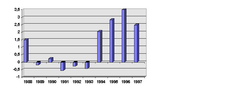 Overzicht verschil lange en korte rente 1988 t/m 1997