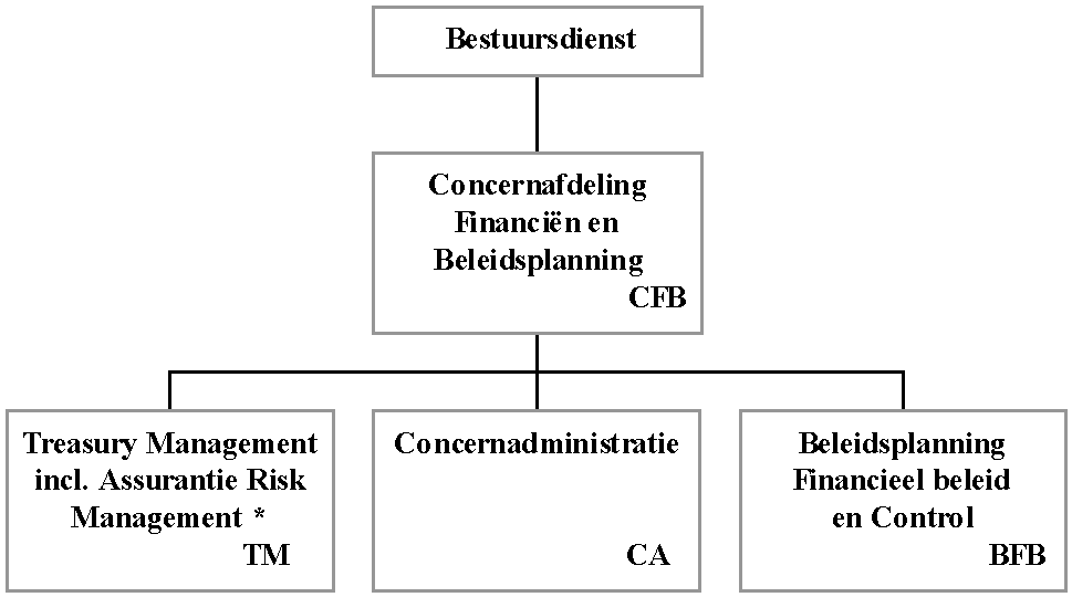 Op dit moment zijn de treasury-activiteiten op concernniveau over twee afdelingen (TM en CA) verspreid. TM is daarbij verantwoordelijk voor het overall-treasurybeleid inclusief kaderstelling. Een onderdeel van de concernadministratie (CA) verricht ondersteunende activiteiten voor TM, met name op het gebied van administratie (o.a. de geldleningen-administratie), controle en liquiditeitenprognose.